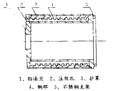 電滑環是我司的主要產品,所用環氧膠的配方就直接涉及其零件之一滑環(其結構如圖1所示)的灌腔質量,由于我們所一直延用過去的配方,在機械加工時,常出現粘接強度不夠,被刀具擠裂,以及出現氣泡、裂紋等現象,為了解決這個問題,我們通過改變環氧樹脂膠粘劑配方、灌膠工藝等措施,來提高環氧樹脂性能和滑環的穩定性。下面就這個問題局部進行探討。
