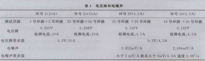 在電機(jī)驅(qū)動電滑環(huán)的過程中,為了防止電滑環(huán)的環(huán)體引線在測試時出現(xiàn)纏繞的情況,將環(huán)體引線串聯(lián)在一起,電刷引線也串聯(lián)一起,并引出加電線和測試線。在電滑環(huán)的電噪聲和電壓降測試過程中,電源通過加電線,對電滑環(huán)的1-24環(huán)路,25-50環(huán)路提供電源,檢測儀器只要對測試線進(jìn)行檢測,就可以測試每一個回來的電壓降和電噪聲。